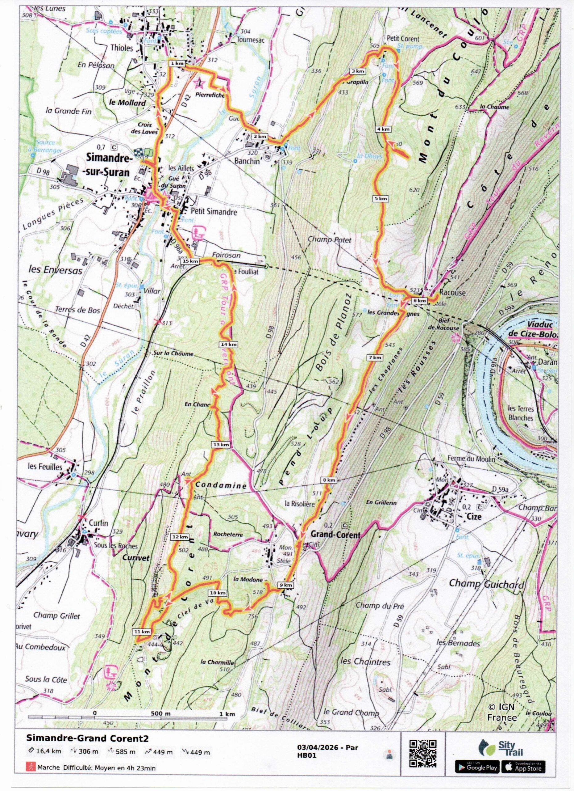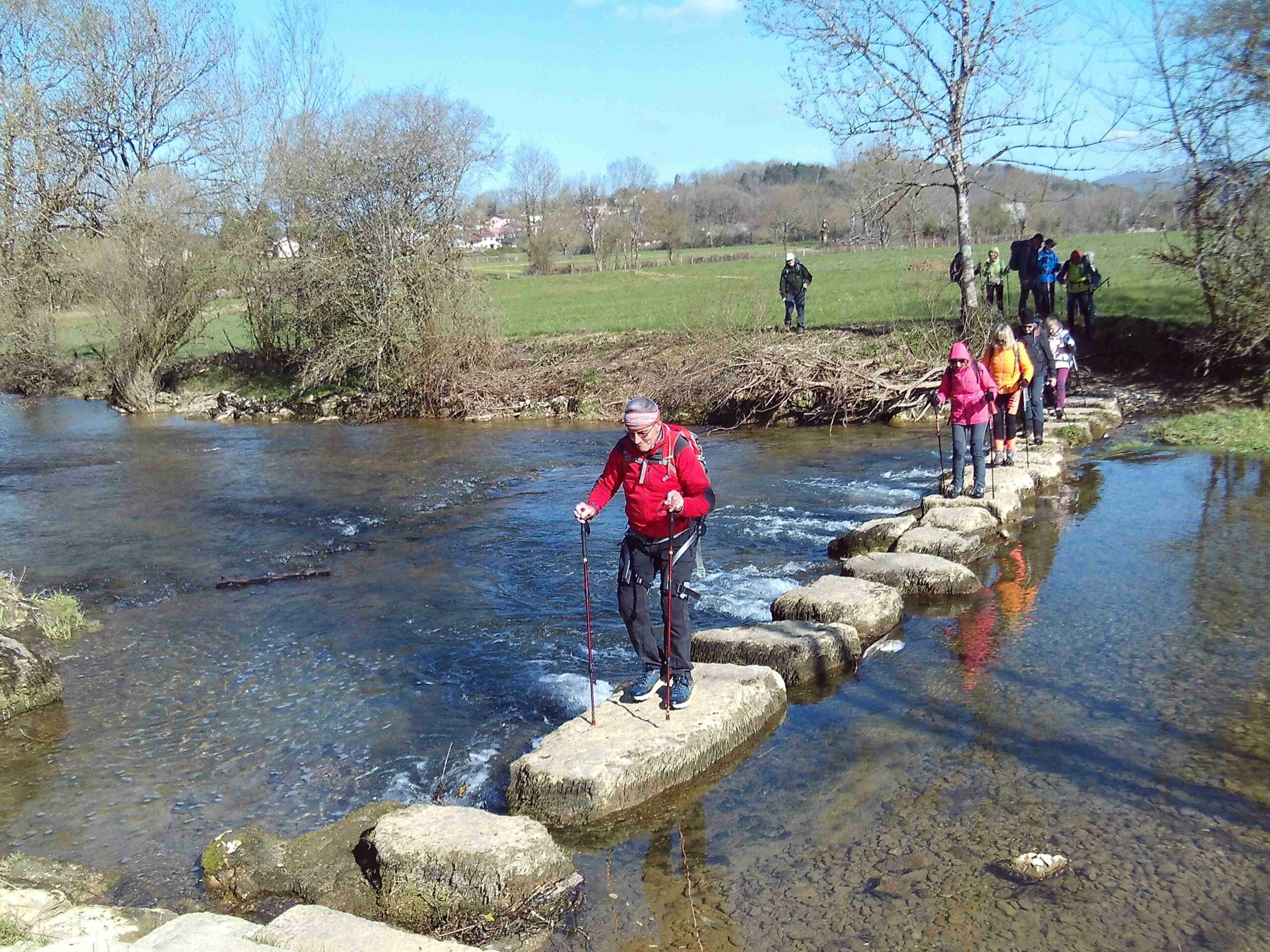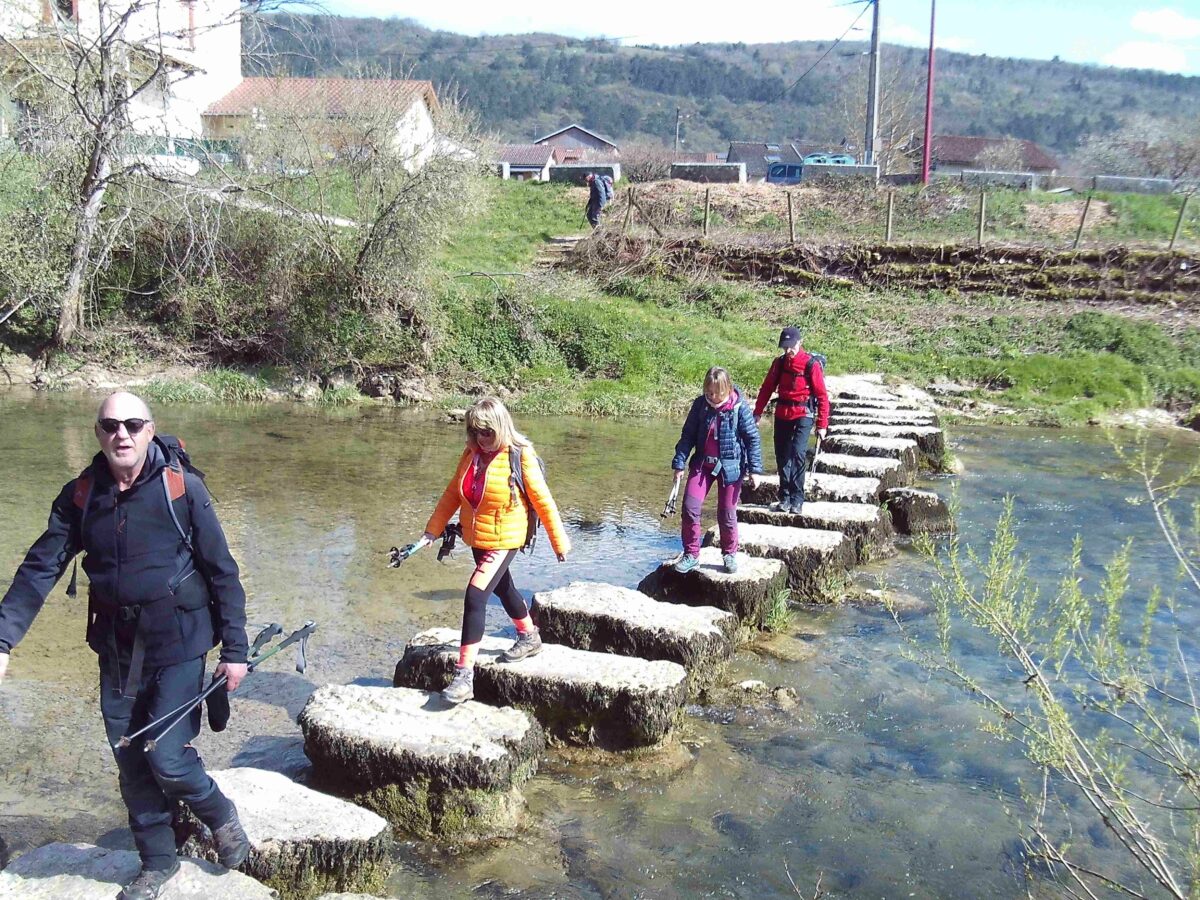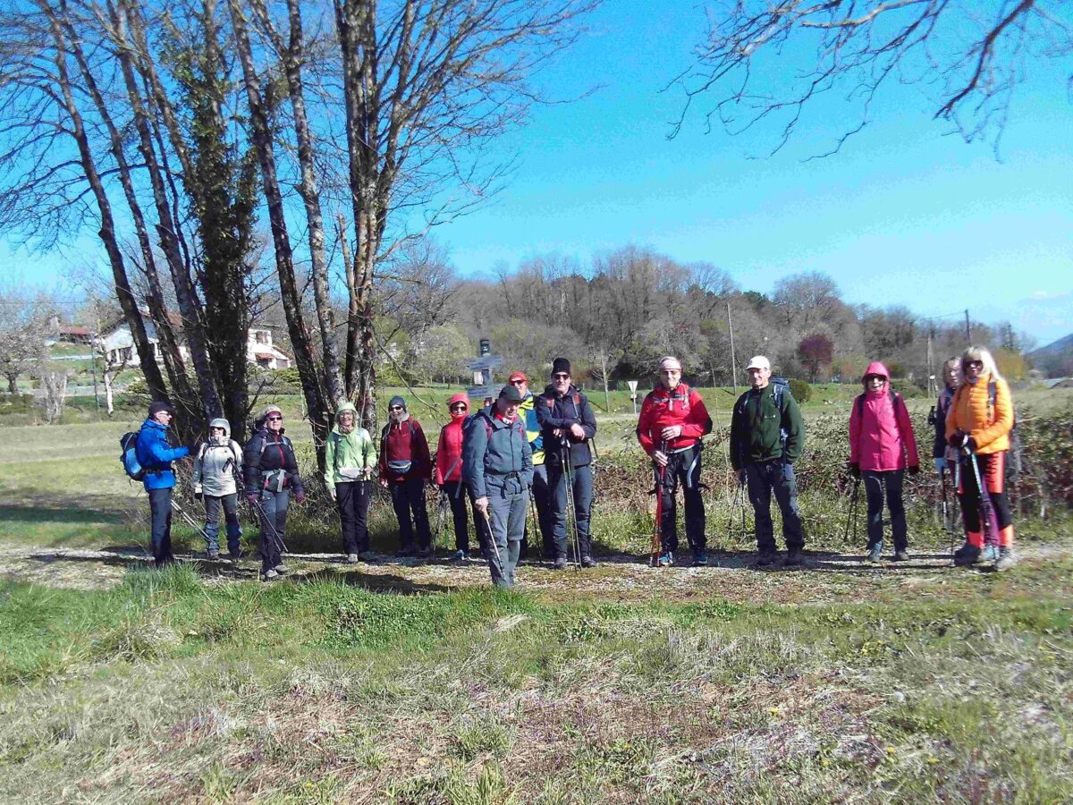 Il fait un peu frais ce matin à cause de la bise, mais le soleil est présent, quoique parfois un peu voilé quand nous partons à quinze de Simandre, d’abord vers la « pierre fichée » au milieu d’un champ à l’entrée du village, le seul menhir du département, témoin du peuplement néolithique de cette belle vallée du Suran. Nous franchissons cette rivière sur un gué pittoresque, puis nous montons à Petit Corent sur le mont du Couloir, avant de cheminer au flanc dudit mont jusqu’à Racouse, petit « haut lieu » de la résistance attaqué en avril 1944, d’où nous apercevons un méandre de l’Ain au fond de ses gorges. C’est à Grand Corent que nous nous restaurons abrités(es) du vent du Nord devant l’église et le cimetière ; nous grimpons jusqu’à la Madone qui domine ce village, redescendons à la falaise, de laquelle nous repartons vers le nord, à travers des pierres taillées abandonnées d’anciennes carrières, jusqu’au relais dominant la vallée. Une petite pause, et c’est la descente vers Simandre par une forêt agréable jusqu’au GRP du tour du Revermont que nous rejoignons peu avant d’atteindre la voie ferrée sur laquelle un Lyria surgit de la montagne. Nous empruntons le gué du camping pour traverser à nouveau le Suran et rejoindre le parking de l’école, à l’issue d’une agréable randonnée d’environ 16 km pour 450 mètres de dénivelé.