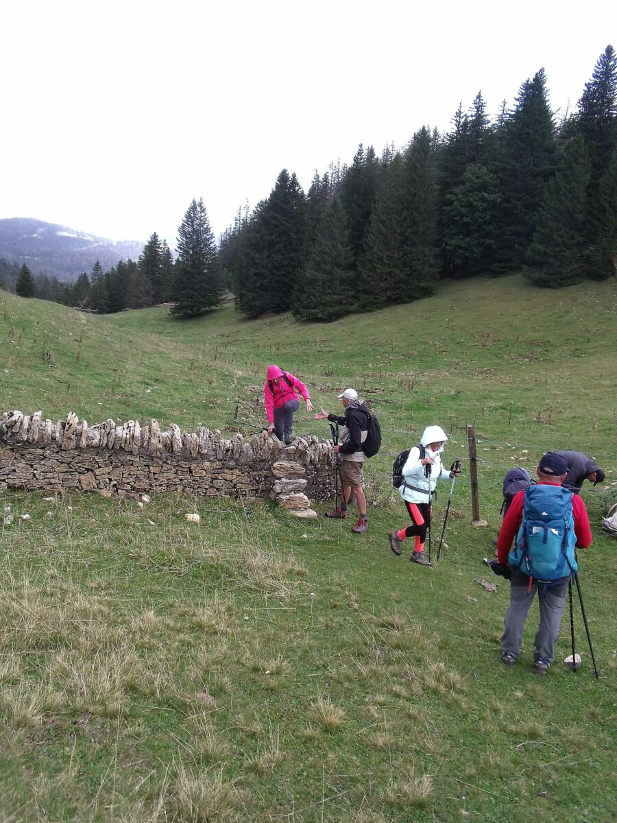 Nous sommes onze à 8 heures dans l’humidité matinale pour partir à Prémanon, plus ou moins dubitatifs(ves) à la perspective d’une météorologie volatile, bien difficile à anticiper tant les probabilités faibles autorisent de multiples scenarii. Aux Dappes, sous un ciel chargé nous partons vers le nord-est dans le goulet de la Givrine, puis, contournant les bosses, nous obliquons vers l’est en direction de Saint Cergue, les nuages gris et même un peu noirs se retiennent. Nous traversons les maisons coites de la périphérie de la petite ville et, nous tournant vers le sud entamons la rude ascension vers la Barillette et son restaurant ; des rafales de vent s’élancent, produisent une brève brumisation, et nous conduisent à nous protéger. Une petite respiration sur la route des Barillettes moins pentue, puis l’ascension reprend en direction du chalet des apprentis, et c’est l’éprouvante montée au col de Porte ; des bancs bienvenus devant le chalet nous y accueillent pour le casse-croûte, tandis que le ciel en colère s’éclaircit et laisse filtrer quelques rayons qui nous dégagent un horizon tourmenté sur l’agglomération de Genève, le lac et le Chablais. Une solide restauration dans la bonne humeur nous permet de porter l’estocade au sommet par le sentier escarpé de l’arête que nous longeons jusqu’au radar, fascinante boule blanche à 1677 mètres d’altitude ; la clarté s’est faite mais l’horizon lointain encore bien flou fait l’objet de commentaires devant la table panoramique. La descente se fait alternativement vers le nord, puis dans la forte pente à l’ouest, sous un ciel devenu agréable, voire ensoleillé. Un groupe restreint mais sympathique pour cette belle randonnée de 14,3 km et 645 mètres de dénivelé.