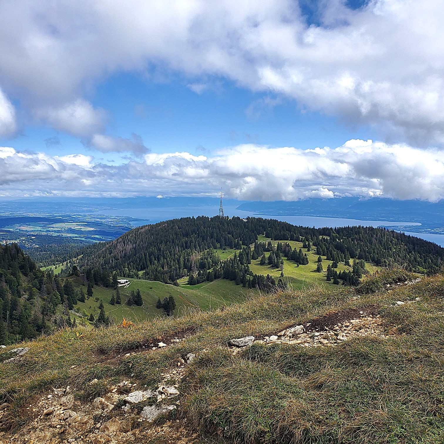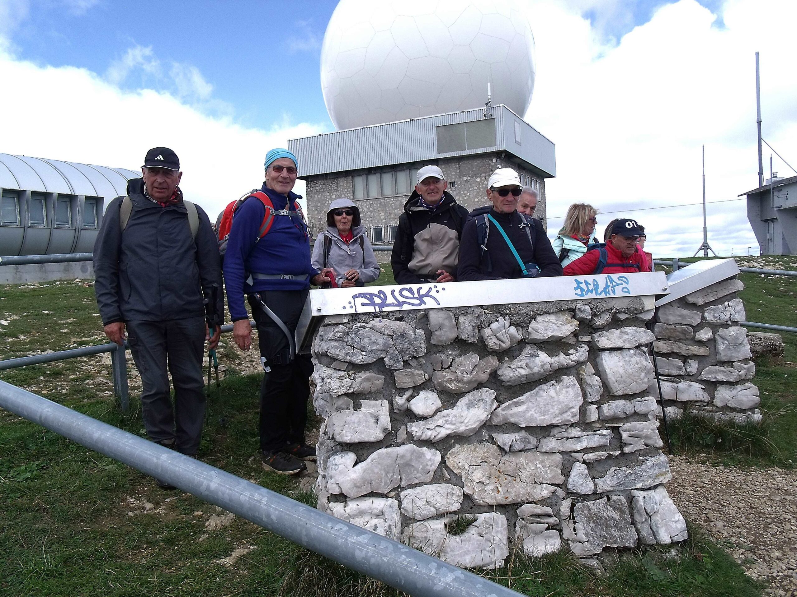 Nous sommes onze à 8 heures dans l’humidité matinale pour partir à Prémanon, plus ou moins dubitatifs(ves) à la perspective d’une météorologie volatile, bien difficile à anticiper tant les probabilités faibles autorisent de multiples scenarii. Aux Dappes, sous un ciel chargé nous partons vers le nord-est dans le goulet de la Givrine, puis, contournant les bosses, nous obliquons vers l’est en direction de Saint Cergue, les nuages gris et même un peu noirs se retiennent. Nous traversons les maisons coites de la périphérie de la petite ville et, nous tournant vers le sud entamons la rude ascension vers la Barillette et son restaurant ; des rafales de vent s’élancent, produisent une brève brumisation, et nous conduisent à nous protéger. Une petite respiration sur la route des Barillettes moins pentue, puis l’ascension reprend en direction du chalet des apprentis, et c’est l’éprouvante montée au col de Porte ; des bancs bienvenus devant le chalet nous y accueillent pour le casse-croûte, tandis que le ciel en colère s’éclaircit et laisse filtrer quelques rayons qui nous dégagent un horizon tourmenté sur l’agglomération de Genève, le lac et le Chablais. Une solide restauration dans la bonne humeur nous permet de porter l’estocade au sommet par le sentier escarpé de l’arête que nous longeons jusqu’au radar, fascinante boule blanche à 1677 mètres d’altitude ; la clarté s’est faite mais l’horizon lointain encore bien flou fait l’objet de commentaires devant la table panoramique. La descente se fait alternativement vers le nord, puis dans la forte pente à l’ouest, sous un ciel devenu agréable, voire ensoleillé. Un groupe restreint mais sympathique pour cette belle randonnée de 14,3 km et 645 mètres de dénivelé.