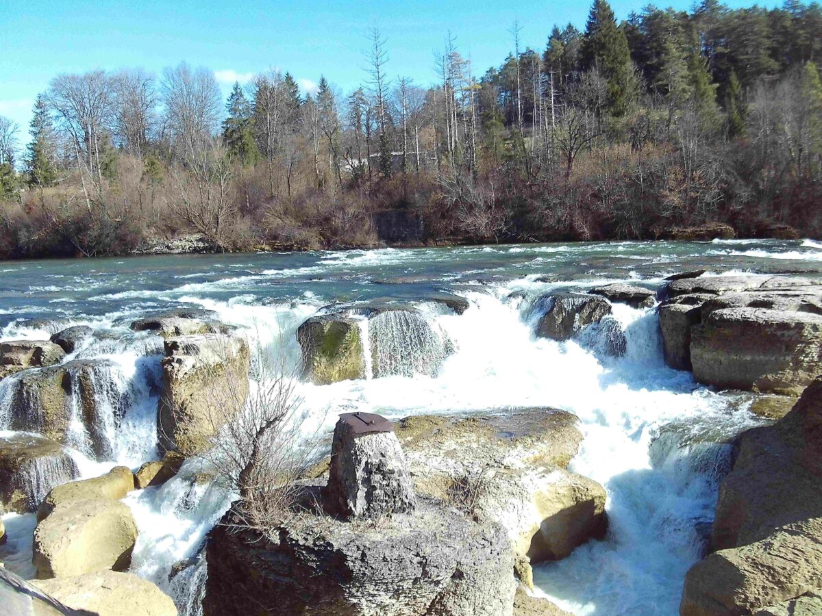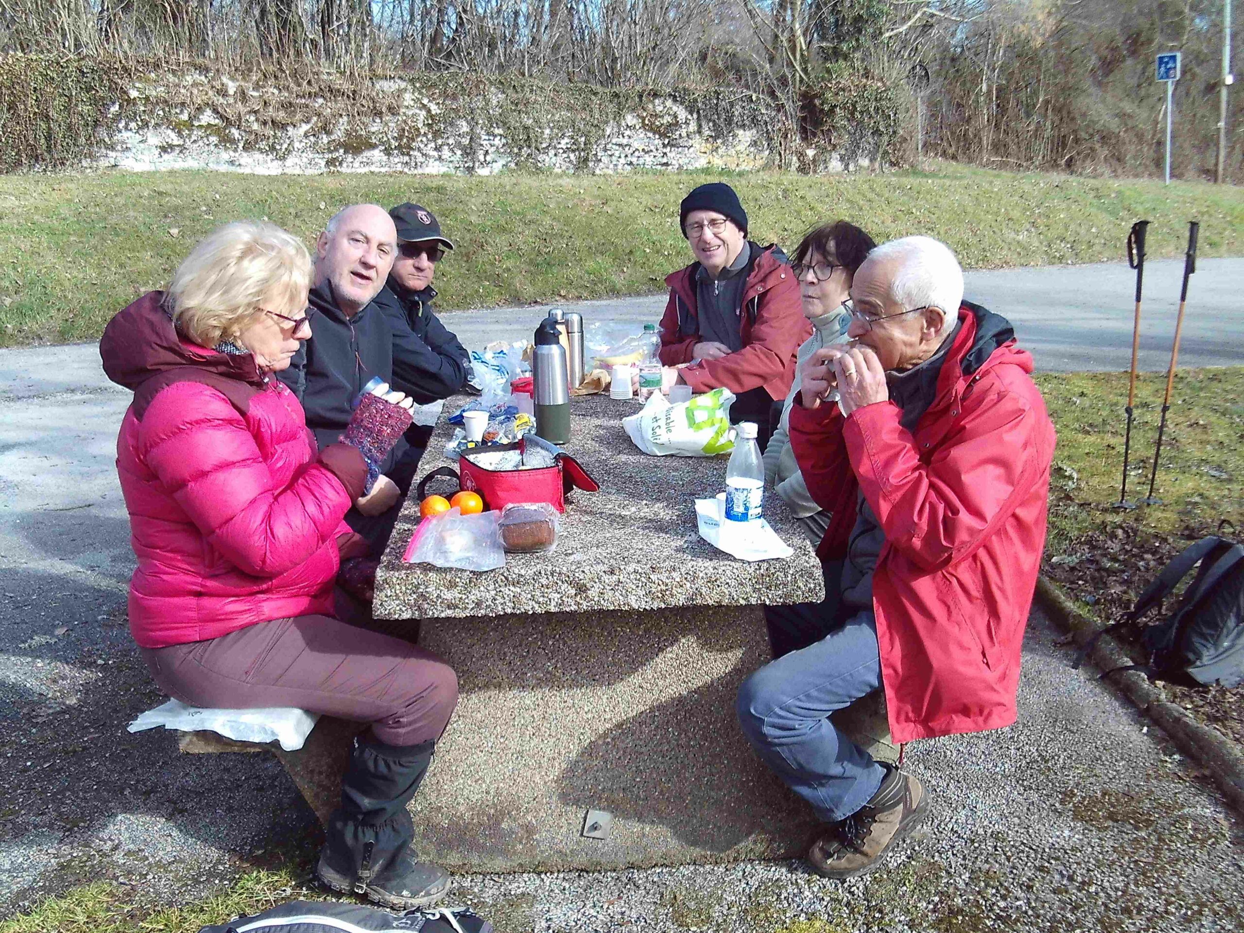 Nous continuons notre chemin jusqu’au port de la Saisse, ou nous admirons le saut de la Saisse sur une passerelle, magnifique endroit naturel ou la rivière d’Ain vient se fracasser sur les gros rochers.Nous décidons de manger le long du parking aménagé de tables et bancs au soleil, malgré un peu de vent.