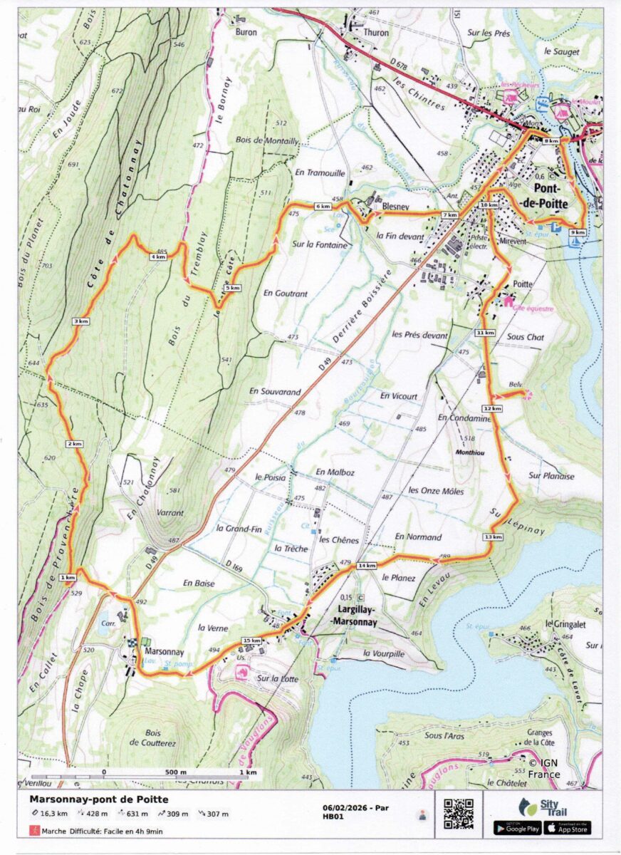 Après manger retour sur Marsonnay en empruntant le GRP Tour du lac de Vouglans qui passe par le village de Poitte, arrêt au belvédère avec la jolie vue sur le plateau et la rivière d’Ain, avant d’arriver à Marsonnay après 5h de marche environ et 15,5 km et 226 m de dénivelé positif.