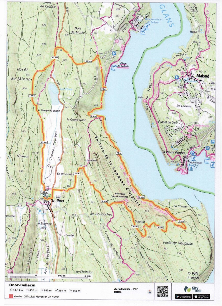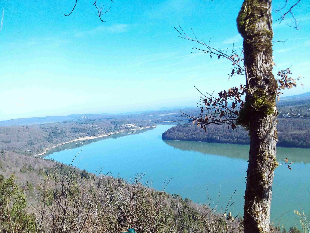 Départ de la randonnée à Onoz dans le Jura, après avoir garé nos trois véhicules sur un parking en dessous de l’église, nous partons en direction du belvédère des Bourlaches ou une superbe vue nous attend sur 180 degrés, la plage de Bellecin sur notre gauche, les falaises du regardoir sur notre droite et en face la plage de la Mercantine. Après une halte au belvédère nous suivons le chemin qui descend dans la forêt de Vaucluse jusqu’à rejoindre le GR qui longe le lac de Vouglans. Nous continuons le chemin jusqu’à la plage de Bellecin. Nous faisons notre arrêt pique nique sur la plage au soleil, on se croirait en été avec la température qui frôle les vingt degrés. Après une pause déjeuner bien méritée nous reprenons notre randonnée en direction d’Onoz, retour par les bois de Musia, la Grange du Chalet, les Champs Courbes avant d’arriver à Onoz.