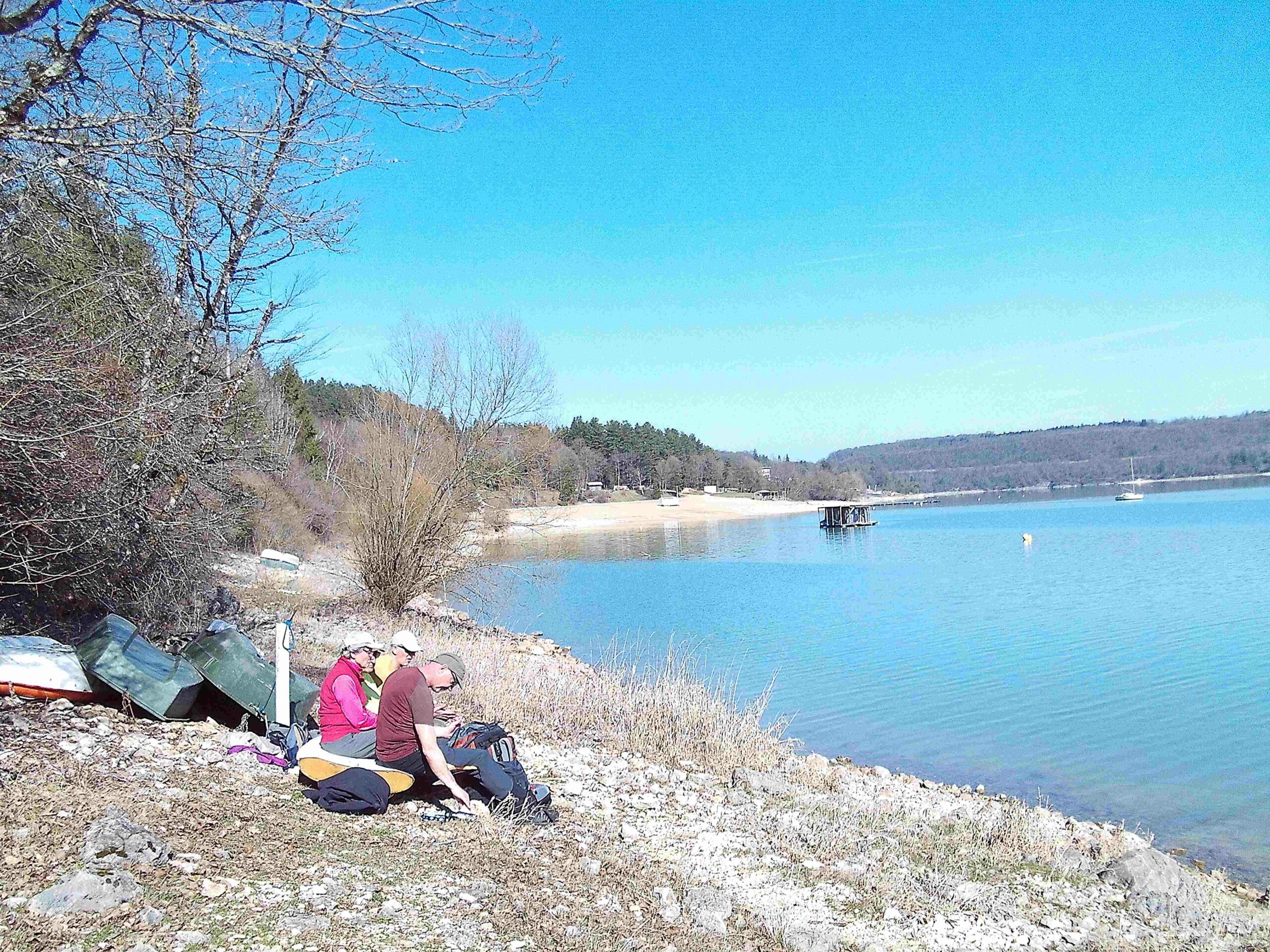 Départ de la randonnée à Onoz dans le Jura, après avoir garé nos trois véhicules sur un parking en dessous de l’église, nous partons en direction du belvédère des Bourlaches ou une superbe vue nous attend sur 180 degrés, la plage de Bellecin sur notre gauche, les falaises du regardoir sur notre droite et en face la plage de la Mercantine. Après une halte au belvédère nous suivons le chemin qui descend dans la forêt de Vaucluse jusqu’à rejoindre le GR qui longe le lac de Vouglans. Nous continuons le chemin jusqu’à la plage de Bellecin. Nous faisons notre arrêt pique nique sur la plage au soleil, on se croirait en été avec la température qui frôle les vingt degrés. Après une pause déjeuner bien méritée nous reprenons notre randonnée en direction d’Onoz, retour par les bois de Musia, la Grange du Chalet, les Champs Courbes avant d’arriver à Onoz.