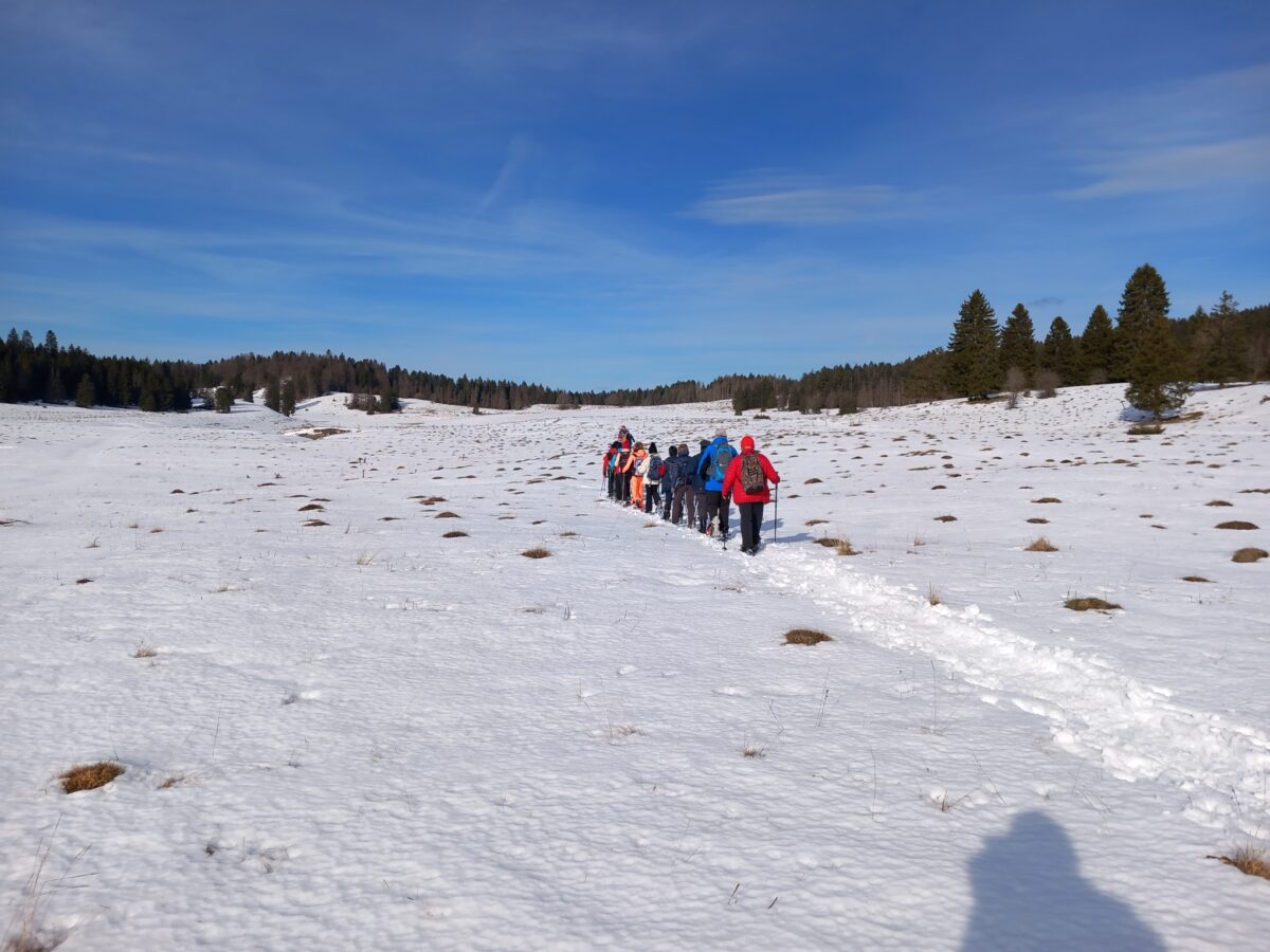 Pour la première sortie de l’année nous sommes dix neuf à partir des portes de Cuvéry en direction de la combe de Merlogne, combe immense, magique pour certains, hantée pour d’autres à cause du phénomène de résurgence (eau qui sort des entrailles de la terre à la fonte des neiges et forme un lac).