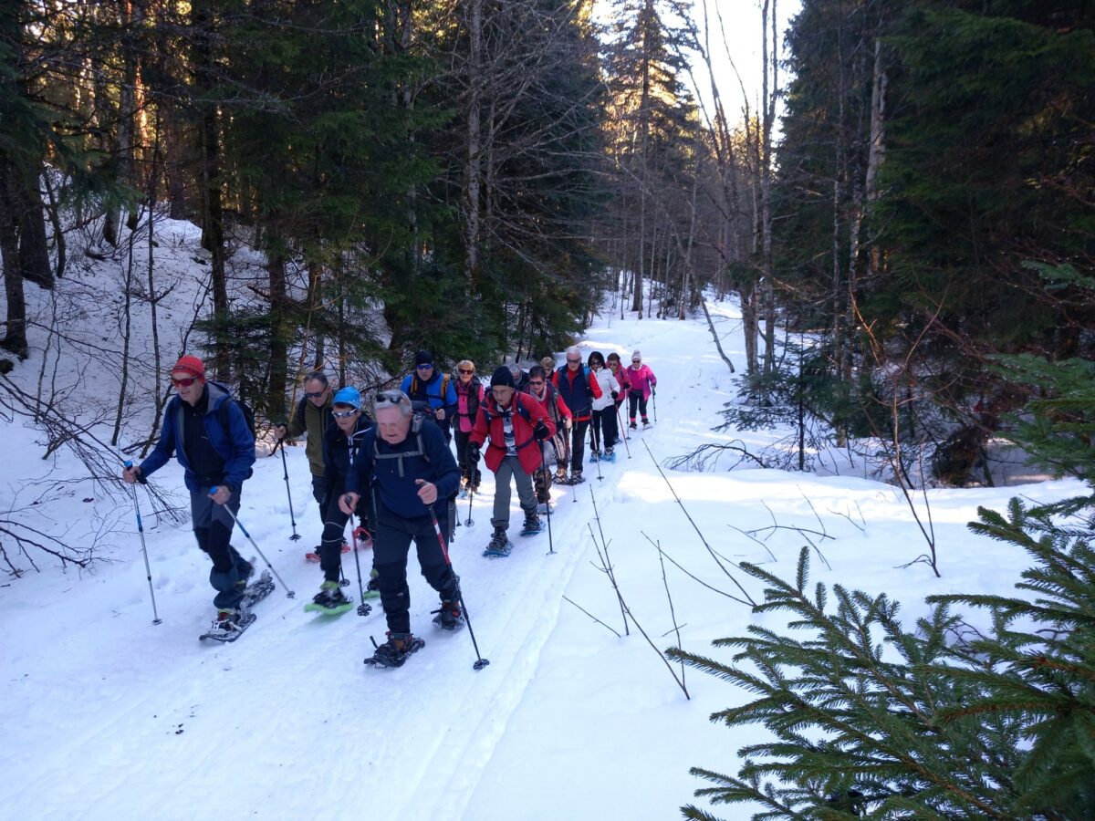 La piste raquettes est gelée en surface,mais la neige est suffisante , soleil et ciel bleu rendent la sortie agréable. Nous commençons la montée dans la forêt pour atteindre le début de la « combe froide »,qui porte bien son nom, un arrêt pour se désaltérer et on parcourt la combe déja très ensoleillée.