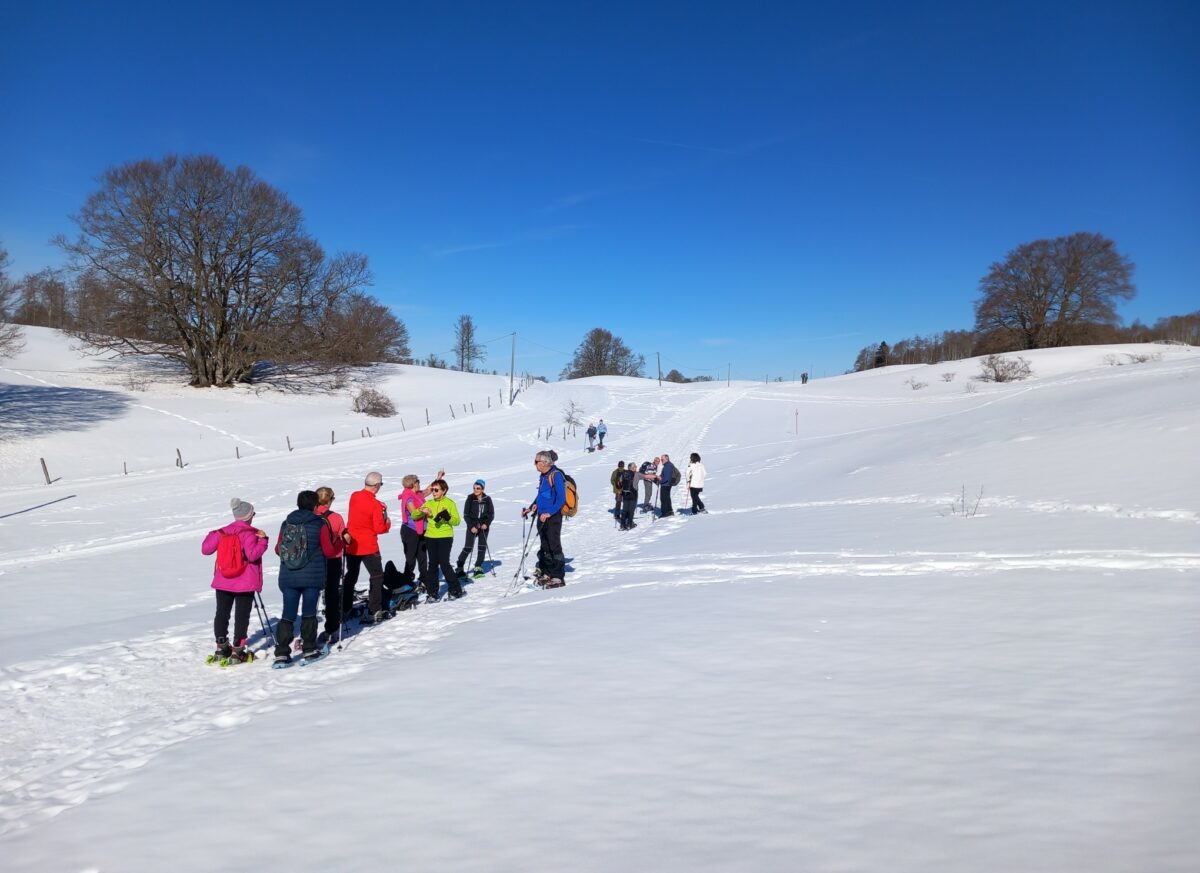 Nous sommes 15 sur le parking de Bellignat pour partir randonner en raquettes sur le plateau de Retord au départ de Cuvéry pour une boucle de 6,6 Kms. Après un petit détour dans notre trajet par Lalleyriat suite aux éboulements sur la route du Poizat, à 10h nous sommes prêts au départ!
