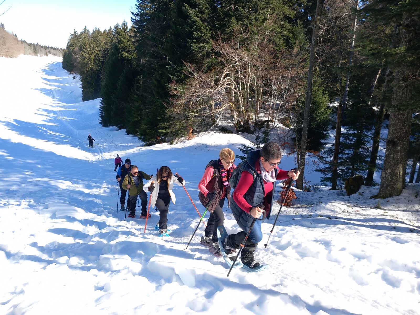 La piste raquettes est gelée en surface,mais la neige est suffisante , soleil et ciel bleu rendent la sortie agréable. Nous commençons la montée dans la forêt pour atteindre le début de la « combe froide »,qui porte bien son nom, un arrêt pour se désaltérer et on parcourt la combe déja très ensoleillée.
