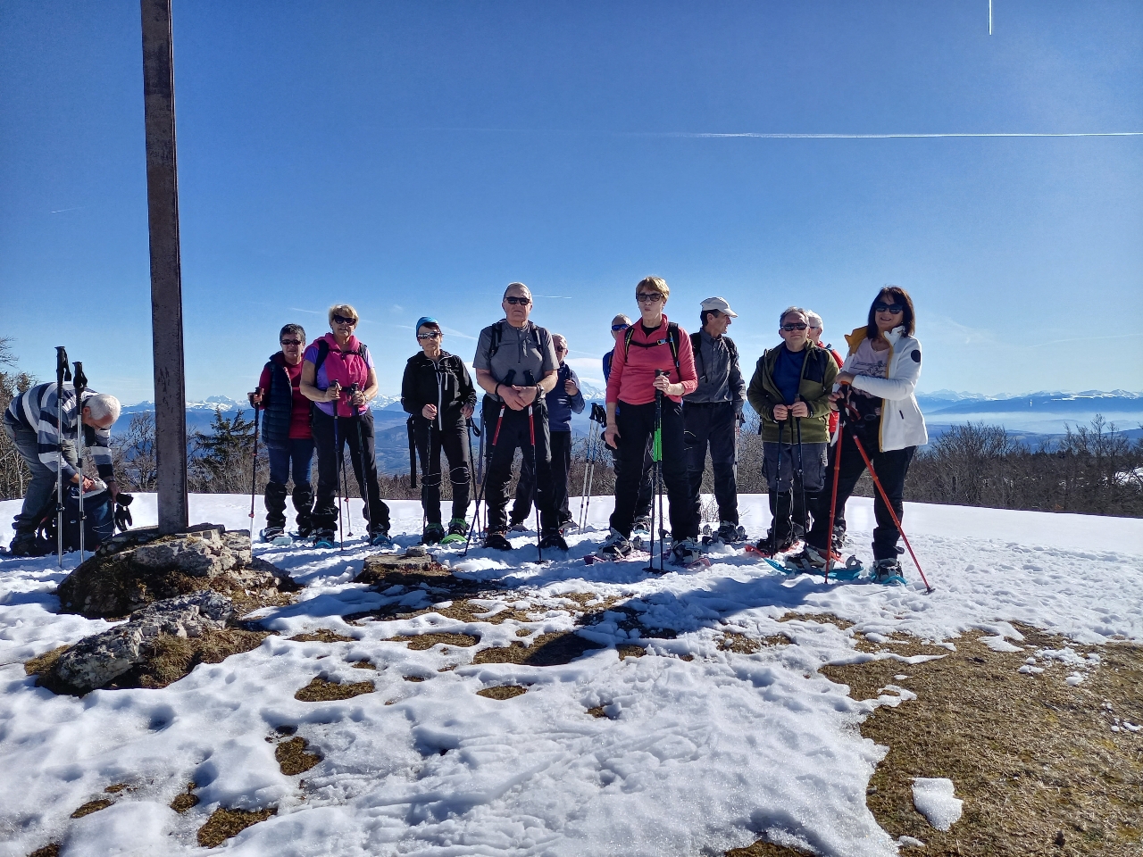 Nous sommes 15 sur le parking de Bellignat pour partir randonner en raquettes sur le plateau de Retord au départ de Cuvéry pour une boucle de 6,6 Kms. Après un petit détour dans notre trajet par Lalleyriat suite aux éboulements sur la route du Poizat, à 10h nous sommes prêts au départ!