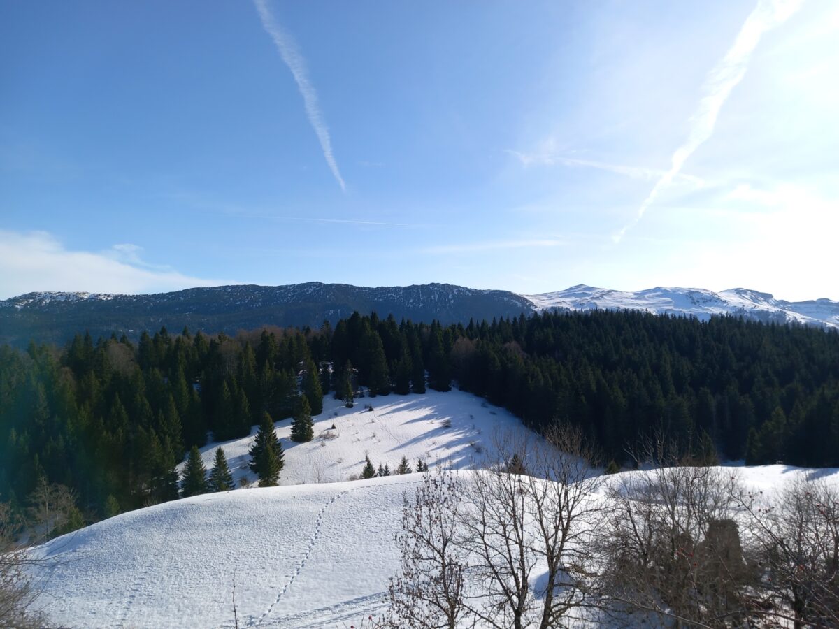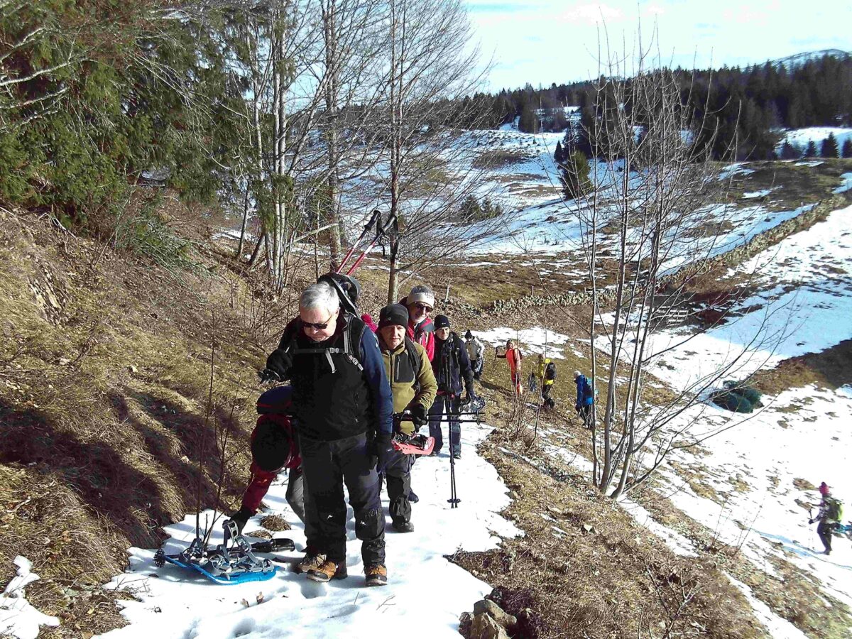 Au sortir du bois les combes sont bien enneigées, raquettes aux pieds nous les traversons par un relief aux montées et descentes(casse pattes) pour déboucher sur la Morseline combe parsemée de dolines glacées, mais malheureusement bien labourées par les passages d’engins de débardage, après avoir évité les fermes par la gauche, la troupe gravit par petites poses, le col des Salettes 1330 m, au franchissement vue sur la chaîne des monts Jura, du Reculet revêtus de blanc.