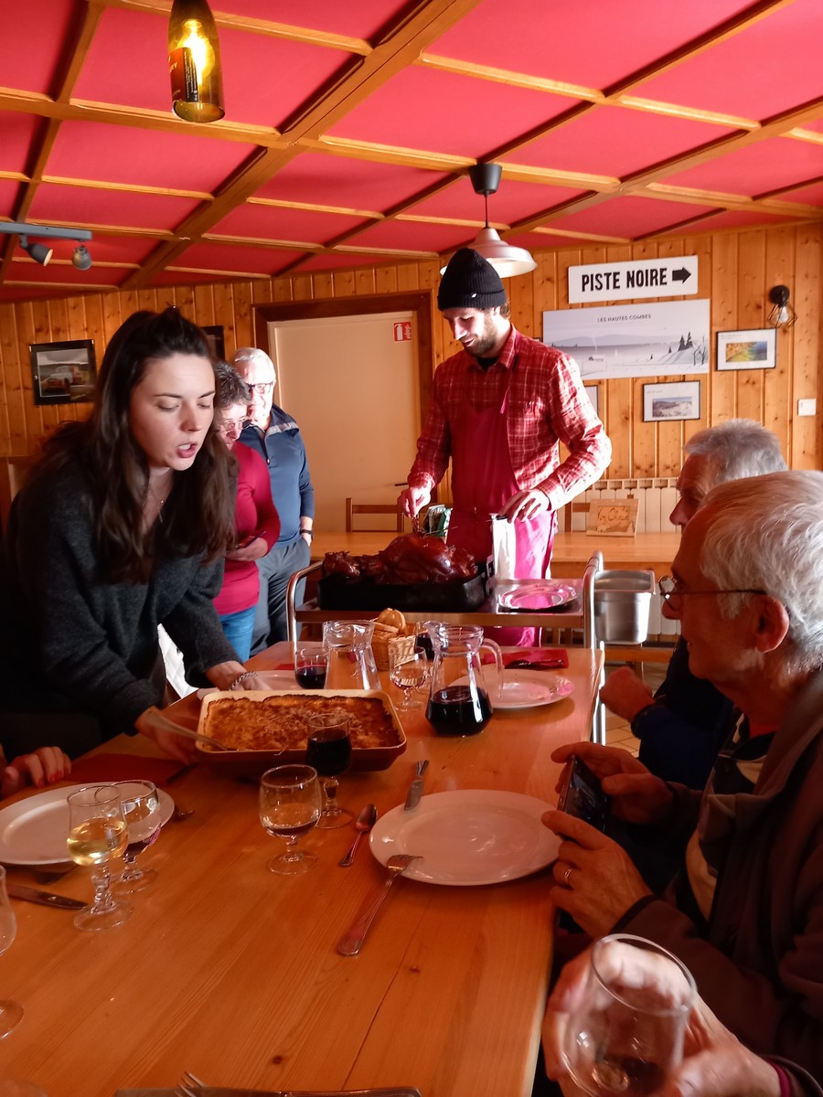 Nous dévalons la pente par le sentier qui contourne la ferme « chez les Sourds » et continuons tout droit vers l’auberge la Guienette où nous nous retrouvons 34 pour le repas ( jambon cuit au foin accompagné d’un gratin sauce aux cèpes) que nous savourons tout en commentant notre randonnée bien agréable malgré une neige de qualité moyenne mais sous un beau soleil.