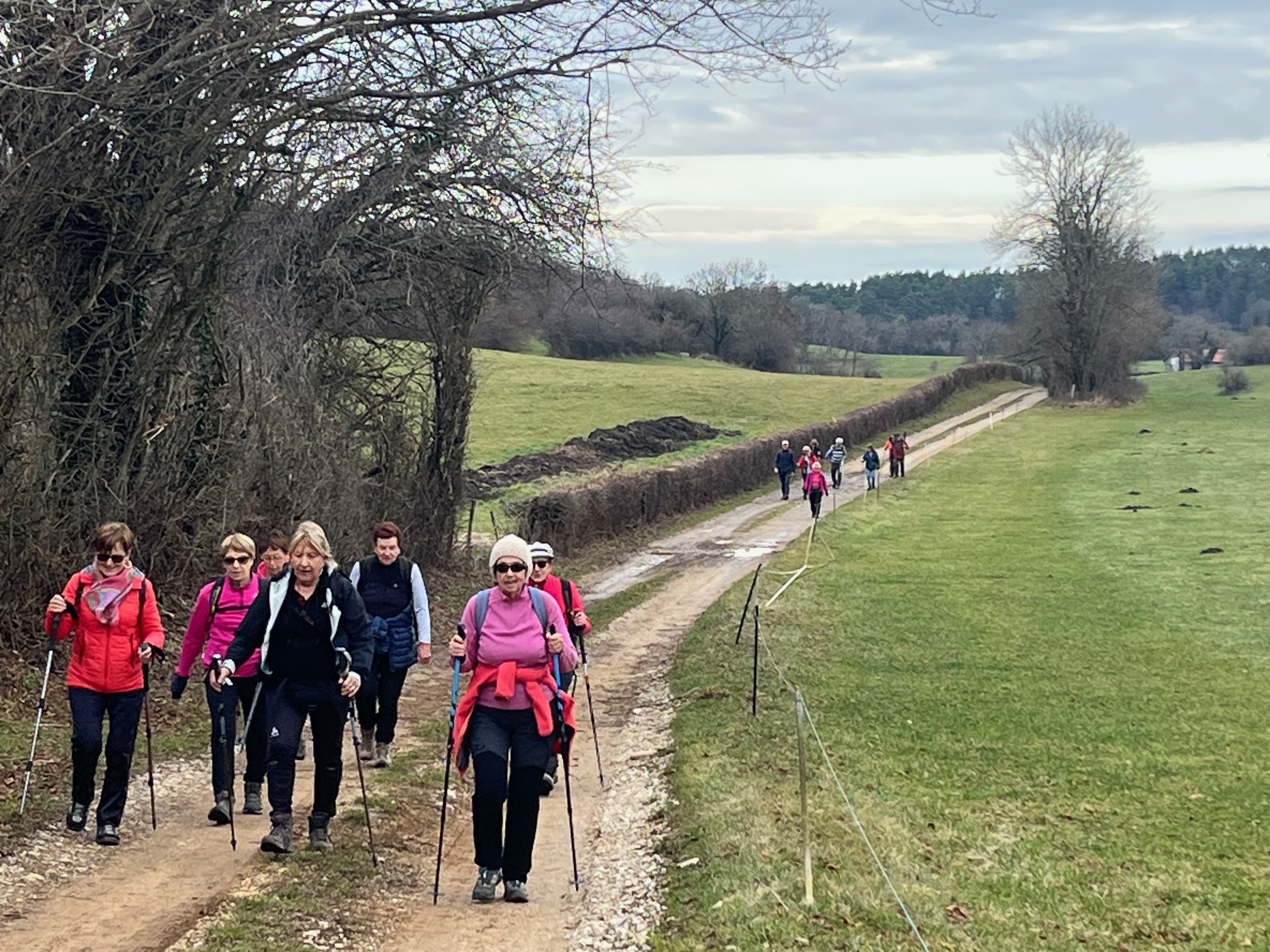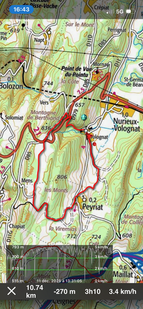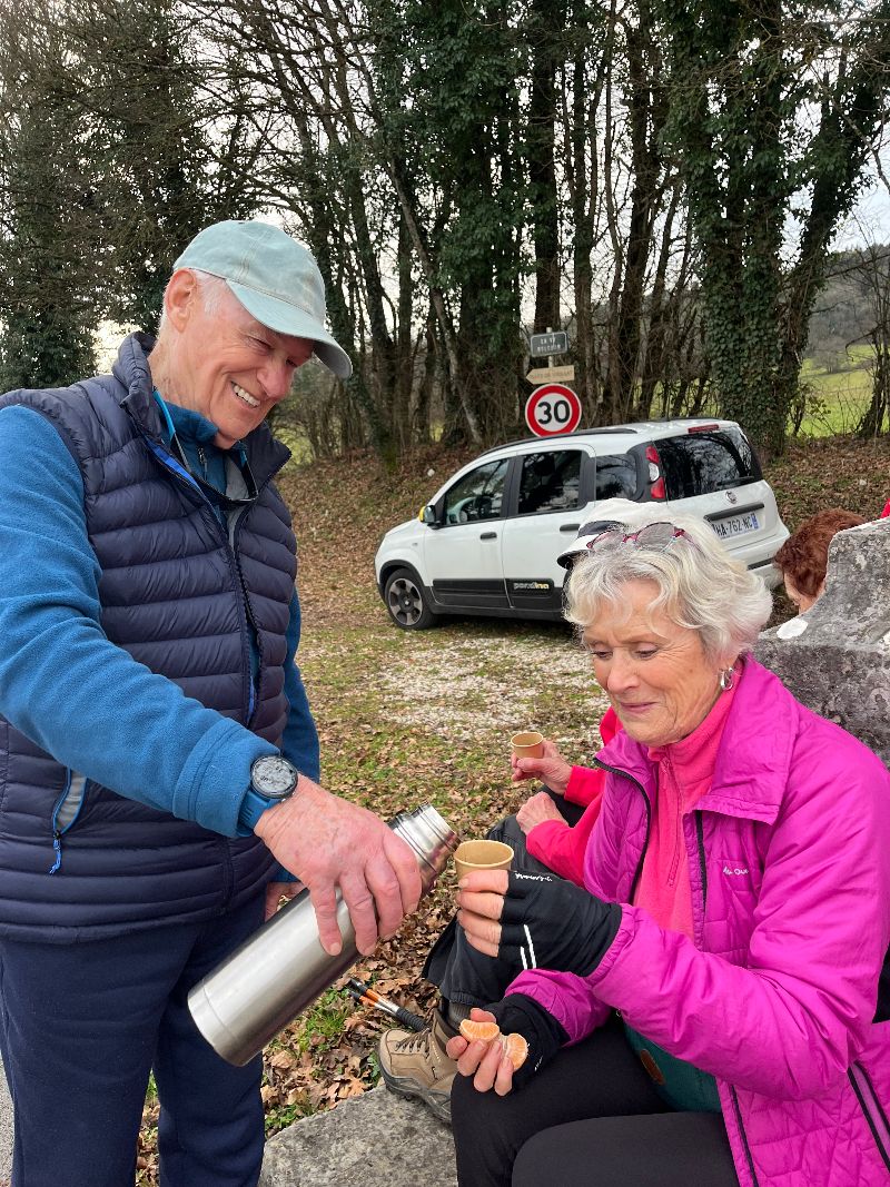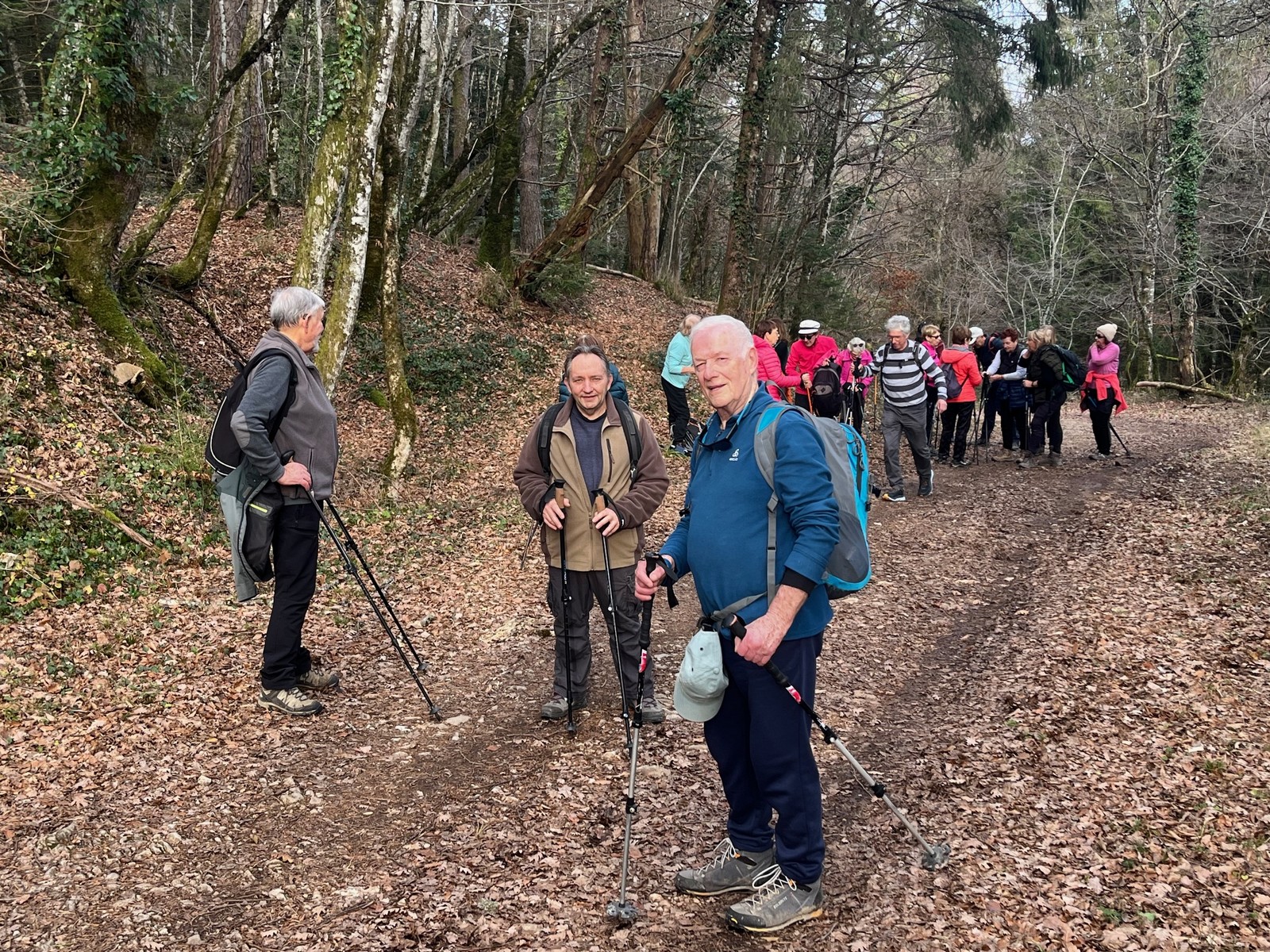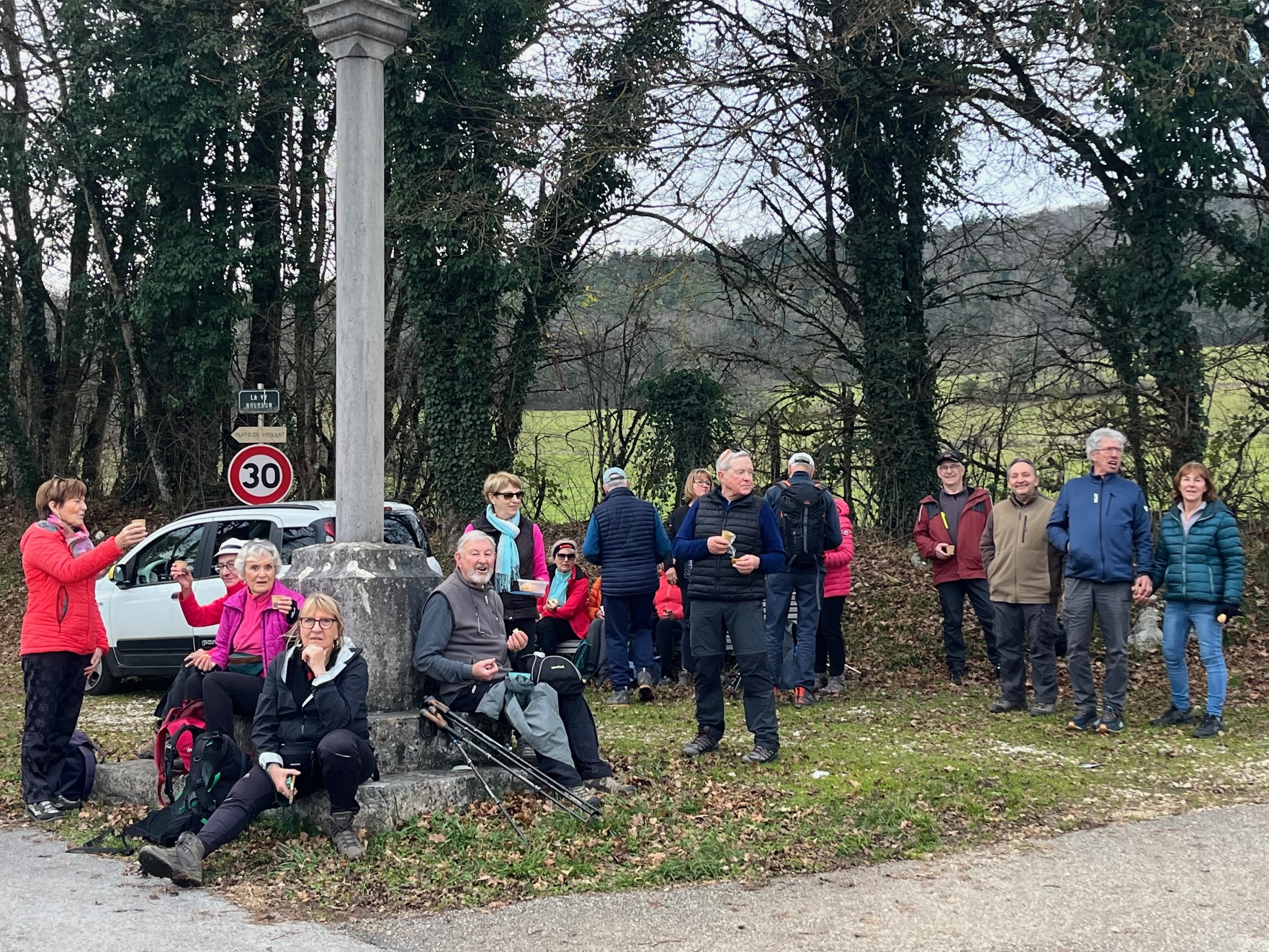 | Arrivés au parking de Bellignat, nous avons cru à un afflux d’adhérents marcheurs à la RSB! En fait c était le Coders de Montréal/Nantua qui avait le même RV que nous!Après séparation, nous sommes 20 à l église de Volognat et là nous entamons la longue (mais régulière)montée vers le col du Berthiand! Quelques gouttes de pluie …et nous traversons la nationale! A partir de là, pas de difficultés ! Un chemin caillouteux nous conduit à Peyriat non sans être passés devant une grande ferme avec cochons, moutons..A la croix de Peyriat, pause goûter et vin chaud! Nous traversons la route Nurieux /Ceignes et entamons la dernière partie de notre parcours à travers champs. Il fait déjà sombre lorsque nous retrouvons les voitures! Boucle de 11kms et 250m de dénivelé ! |