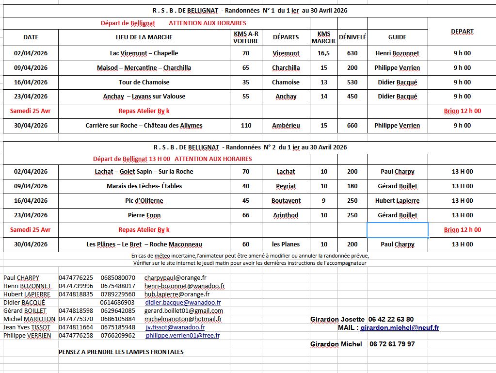 Veuillez trouver les Tableaux des Marches pour les mois de